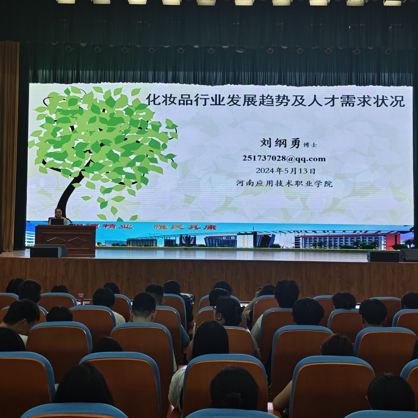 2024年5月14日,广东食品药品职业学院化妆品技术专业学科带头人、广东省化妆品科学技术研究会创始会长、全国轻工职业教育教学指导委员会日用化工专委会委员、全国药品职业教育教学指导委员化妆品专委会委员刘纲勇博士应邀来到必赢官网指导化妆品专业建设,并给化妆品经营与管理专业全体师生作了题为《化妆品行业发展趋势及人才需求》的专题讲座。