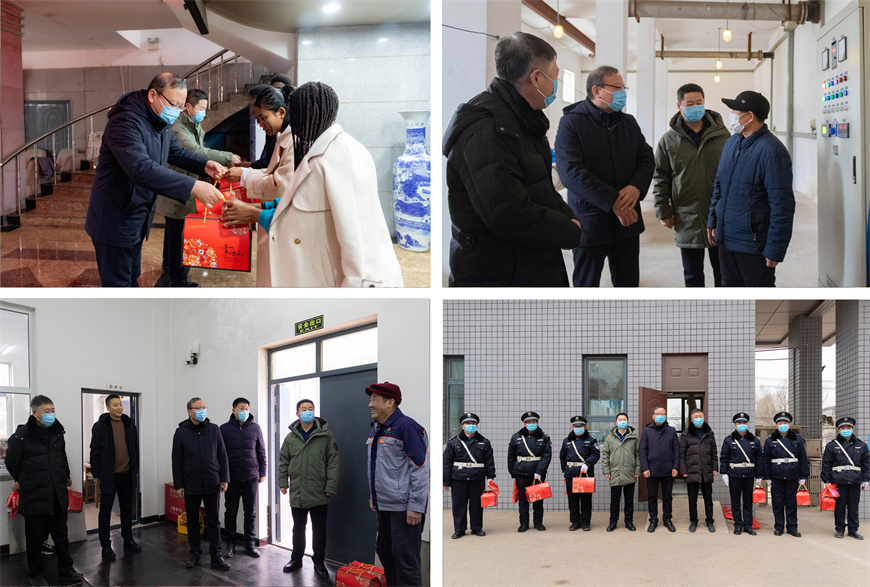 校领导先后走访了学校南区水泵房、西门门卫、变电所和留学生公寓,亲切看望了值班的工作人员和在校的留学生,热情地与他们握手交流,并送去新春礼包。