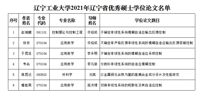 6月2日,辽宁省教育厅、辽宁省人民政府学位委员会下发了《关于公布2021年辽宁省优秀博士、硕士学位论文评选结果的通知》(辽教通〔2022〕86号)。beat365官网6篇论文获评辽宁省优秀硕士学位论文,再创历史新高,位于省属同类高校前列。其中,庞洪博副教授指导的1篇论文以抽检“优秀”直接入选(全省抽检论文中仅有31篇被评为“优秀”)。