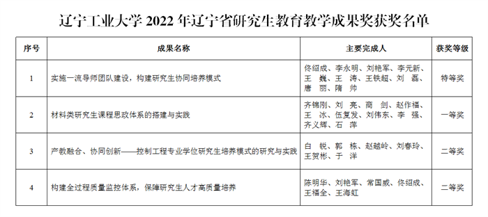 近日,辽宁省教育厅下发了《关于公布2022年辽宁省研究生教育教学成果奖获奖名单的通知》(辽教通〔2022〕109号)。beat365官网推荐的4项成果全部获评2022年辽宁省研究生教育教学成果奖,其中特等奖1项,一等奖1项,二等奖2项。