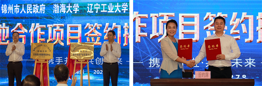 仪式上,王心宇和钱英伟共同为beat365英国官方网站“数字创意产业发展中心”“文化设计创新研究中心”项目揭牌;刘艳军代表学校与锦州市文旅广电局签订校地合作项目协议书。