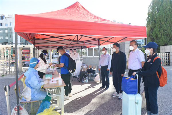暑去凉来,忽而已秋。9月20日,学校迎来了秋季学期第一批返校的学子。校党委书记钱英伟、校长王琦、校党委副书记张启俭带领相关部门负责同志深入返校现场,先后到南门学生报到处、核酸检测点、学生公寓、食堂、超市等重点区域检查指导学生返校和疫情防控工作,详细了解学生入校流程,认真查看各环节疫情防控落实情况。校领导在检查时强调,要全力做好学生返校疫情防控工作,严格落实测温、查验健康码和行程卡,做好核酸检测、行李消杀等工作,确保把好入校第一道关口。要加强餐饮和住宿服务等后勤保障工作,切实为学生提供周到细致的服务,为返校学生营造安全、舒适的环境。