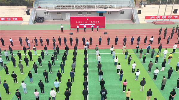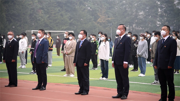 10月1日,迎着十月第一缕晨光,beat365官网师生代表齐聚体育场,举行“喜迎二十大,一起向未来”——庆祝中华人民共和国成立73周年升旗仪式。在校值守的校领导王琦、张启俭、刘艳军,及中层干部和2022级研究生参加了本次活动。