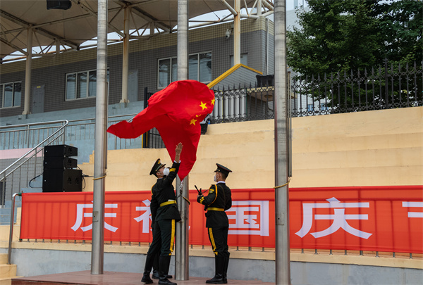 7时整,升旗仪式正式开始。由退伍大学生组成的国旗护卫队英姿飒爽,迈着铿锵的步伐护送国旗走向升旗台,展旗手将国旗抛出,鲜艳的国旗如同朝阳跃出地平线,伴随着雄壮的国歌,五星红旗冉冉升起、迎风飘扬。在场师生庄严肃立,行注目礼,齐声高唱国歌,炽热的爱国情怀在每一位师生心中澎湃、激荡。