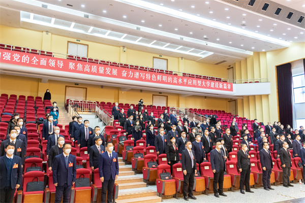 图书馆报告厅气氛庄重热烈,主席台正中悬挂着金色党徽,十面鲜艳的红旗分列两侧。本次大会是在深入学习贯彻落实习近平新时代中国特色社会主义思想和党的二十大精神的重要时刻,学校事业发展和质量提升进入攻坚期的关键节点召开的一次十分重要的会议。大会的主题是:以习近平新时代中国特色社会主义思想为指导,全面贯彻党的二十大精神,弘扬伟大建党精神,坚持和加强党的全面领导,落实立德树人根本任务,聚焦学校事业高质量发展,进一步解放思想、凝心聚力、攻坚克难、勇毅前行,奋力谱写特色鲜明的高水平应用型大学建设新篇章。