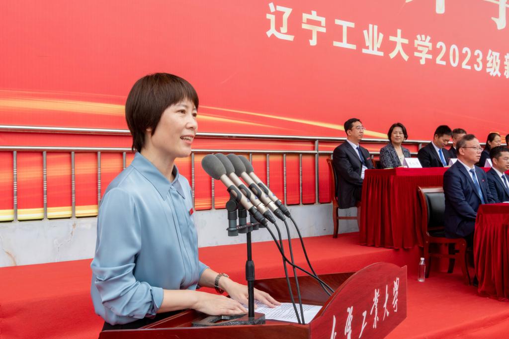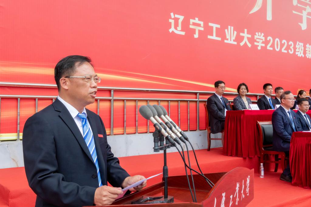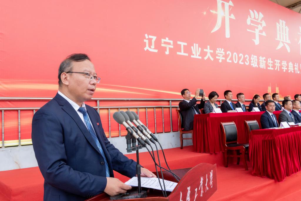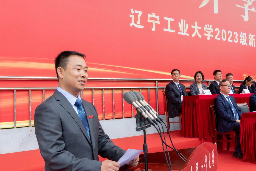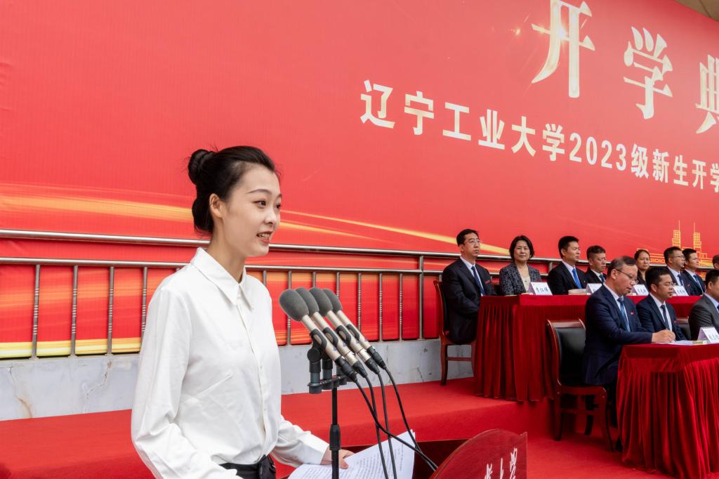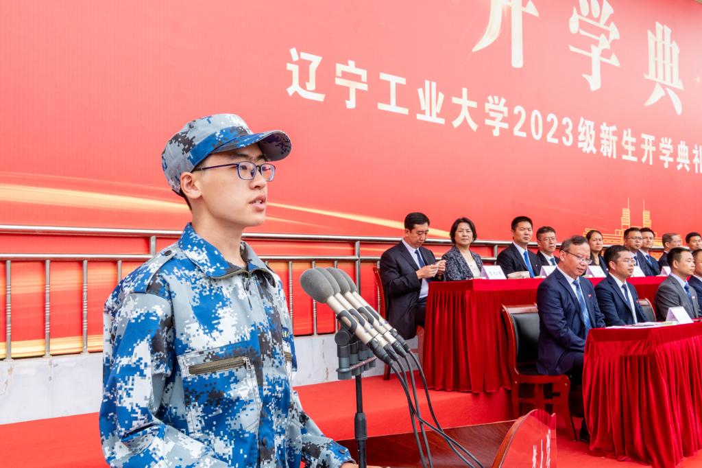 2023级新生代表、电子与信息工程学院高斯腾同学发言。他向大家介绍了英雄的城市家乡锦州以及城市的历史赋予辽工大代代相传的红色基因。他带领全体新生向辽工大郑重承诺:做胸怀天下、心系家国的人;做勤奋刻苦、踏实求学的人;做诚实守信、品德高尚的人。誓言铿锵,从今天起,辽工大的烙印将会与你们相伴前行。