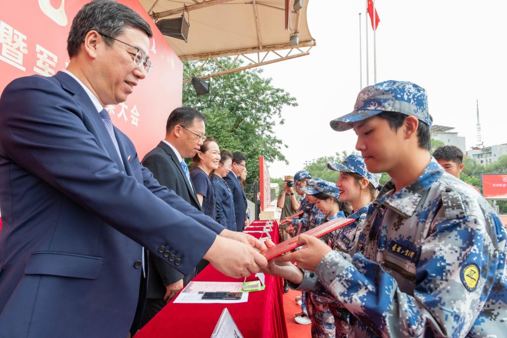 学生工作处处长张钦华宣读军训先进个人、军训内务先进寝室名单。主席台领导为先进个人、先进寝室代表颁奖。