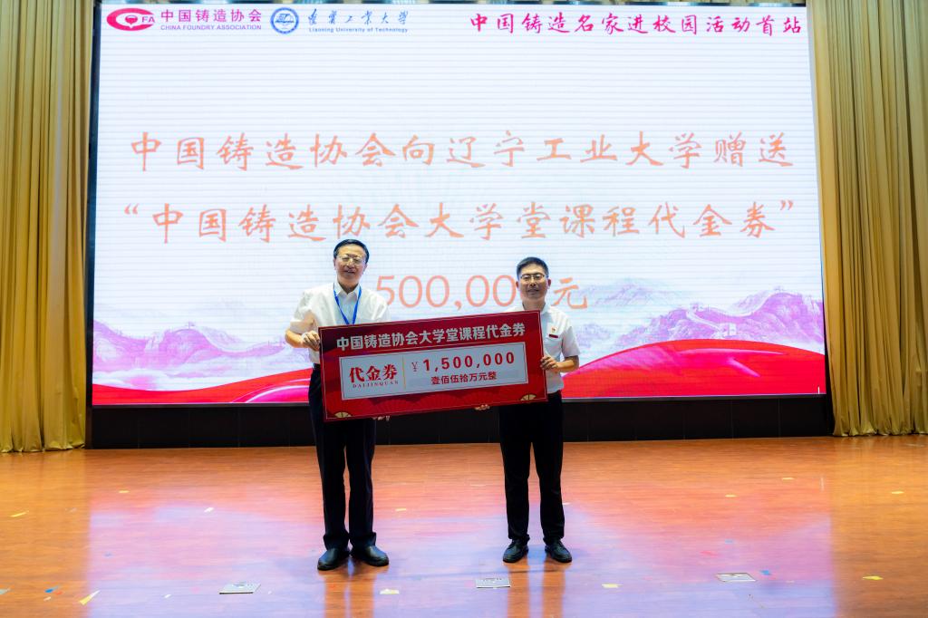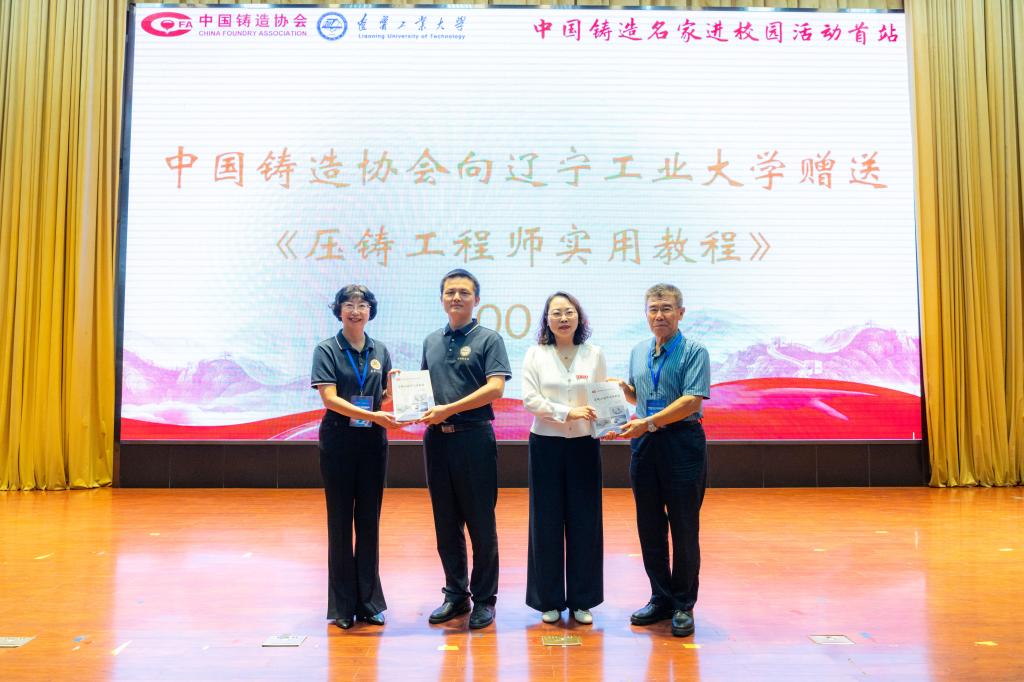 张立波代表中国铸造协会向beat365英国官方网站赠送“中国铸造协会大学堂课程代金券”150万元。中国铸造协会执行副会长范琦、布勒(中国)机械制造有限公司总顾问卢宏远代表中国铸造协会赠送《压铸工程师实用教程》100册。