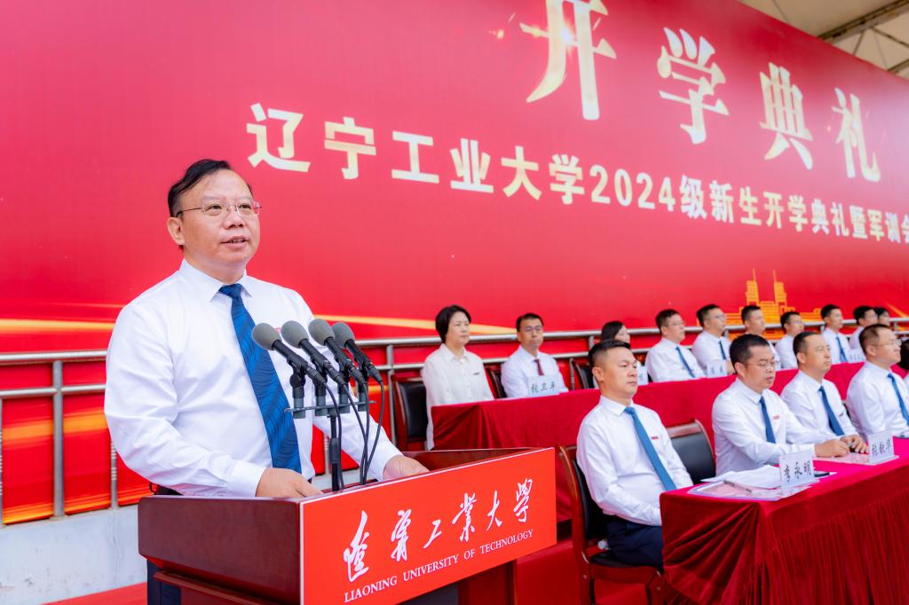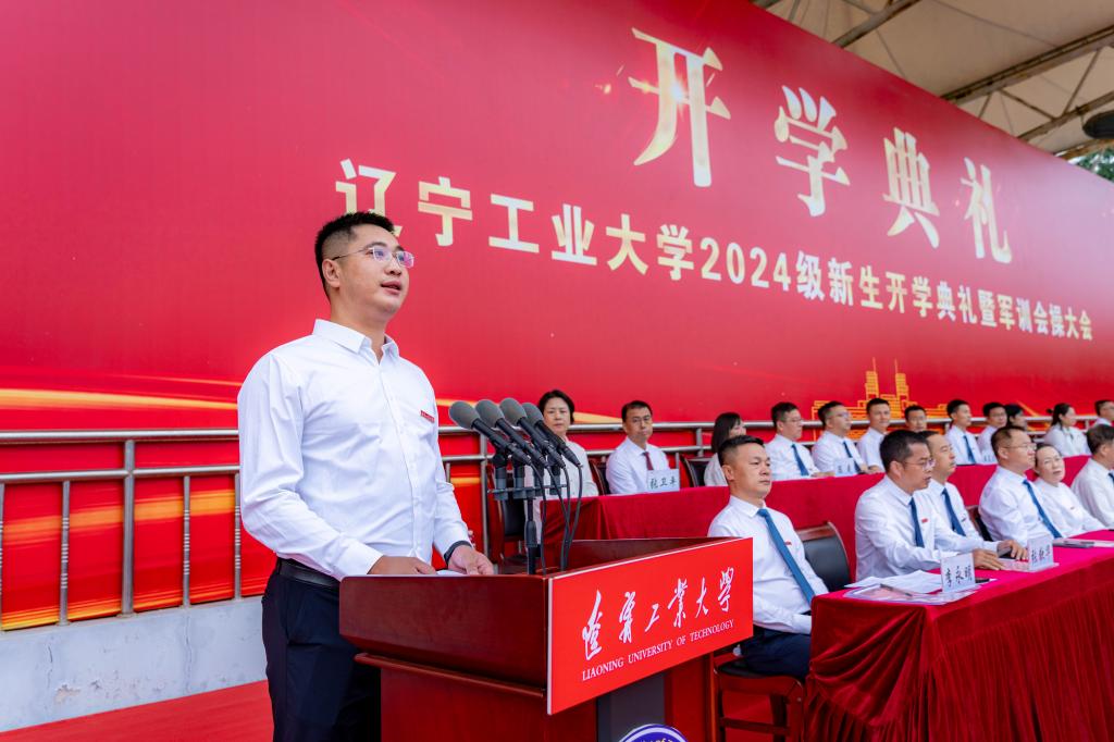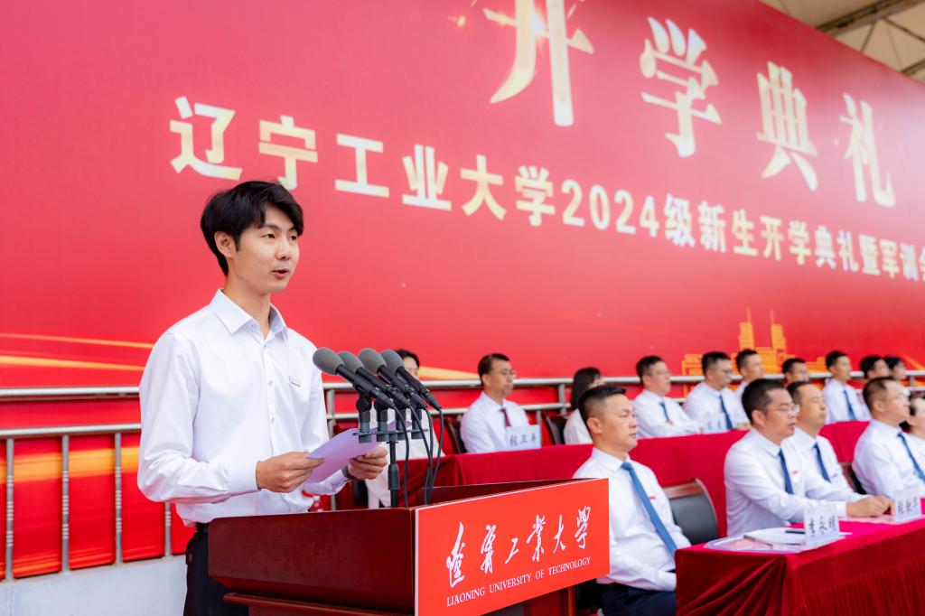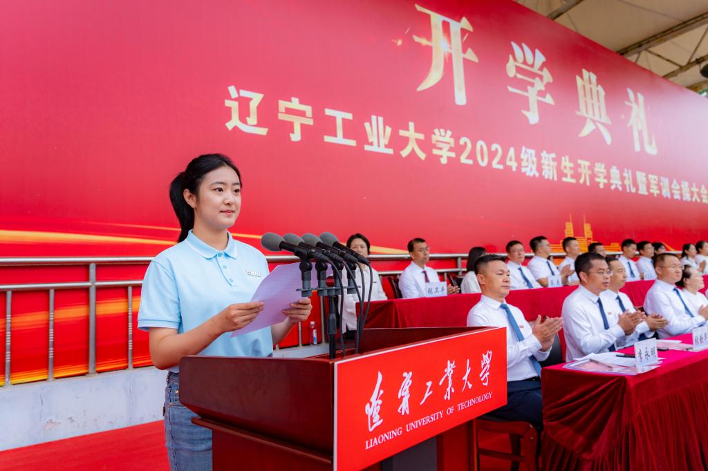 2024级新生代表、电气工程学院王一竹同学发言。她分享了初临辽工大的欣喜和感受。她带领全体新生向辽工大郑重承诺:做目标明确,脚踏实地,锲而不舍的合格辽工大人;做珍惜时光,锐意进取,求知勤勉的优秀辽工大人;做勇于思考,开拓创新,永不服输的卓越辽工大人。