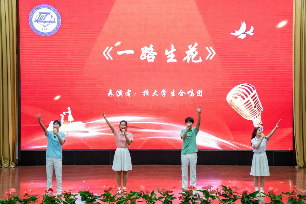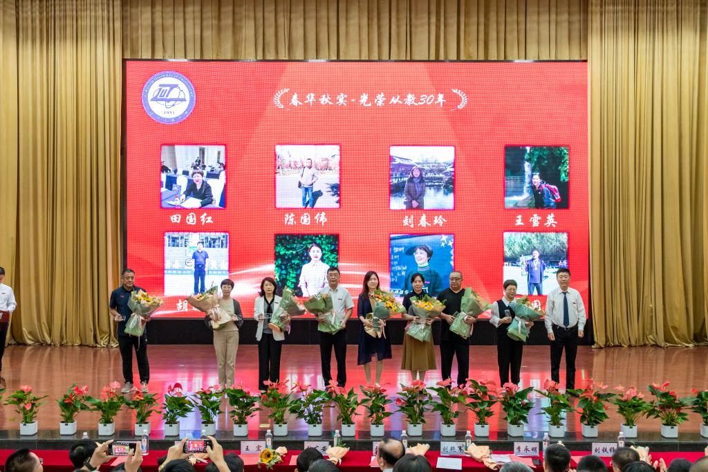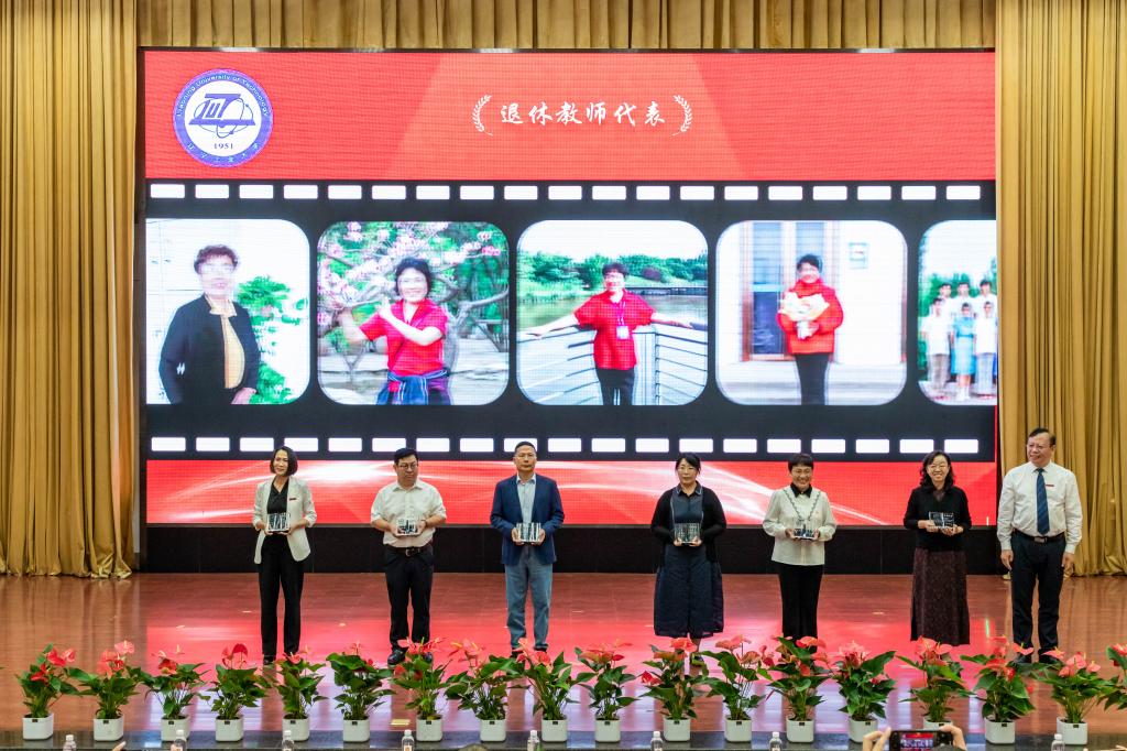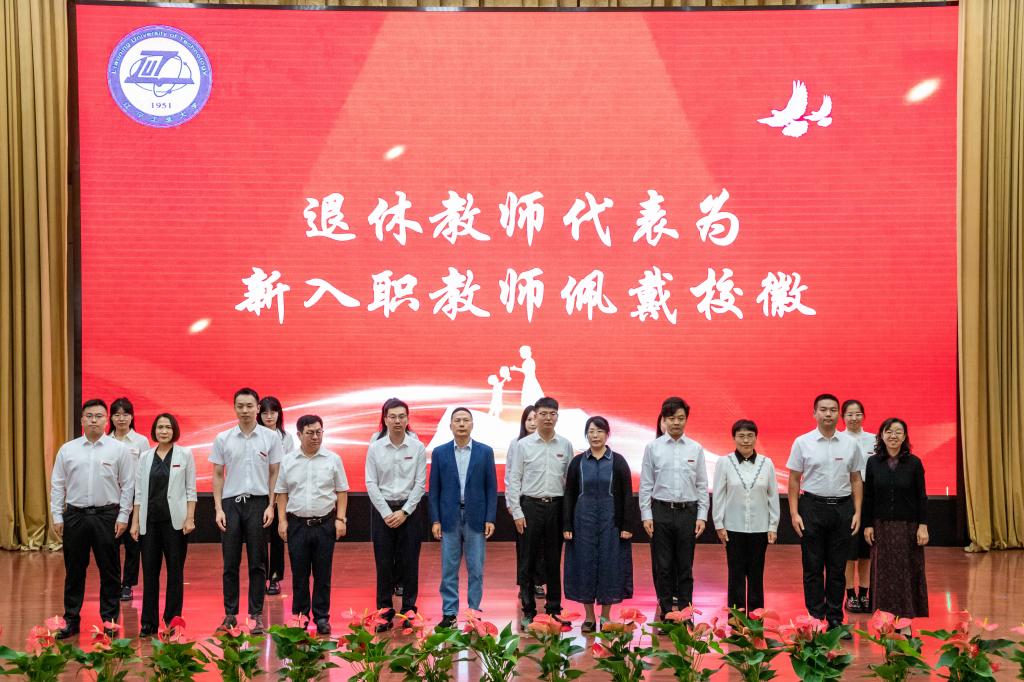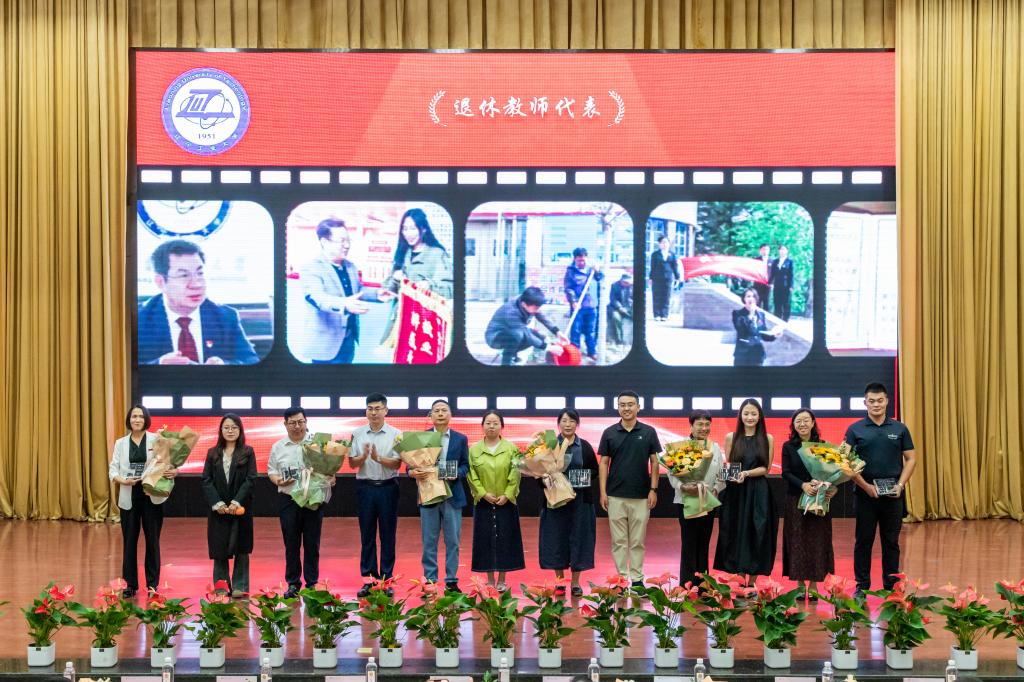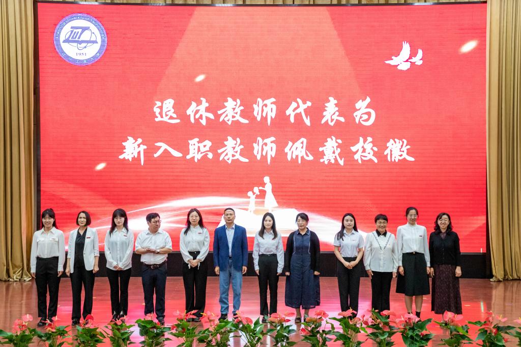 毕业生代表专程返校为退休教师赠送鲜花,退休教师代表为新入职教师代表佩戴校徽,将立德树人的接力棒传到他们手中。
