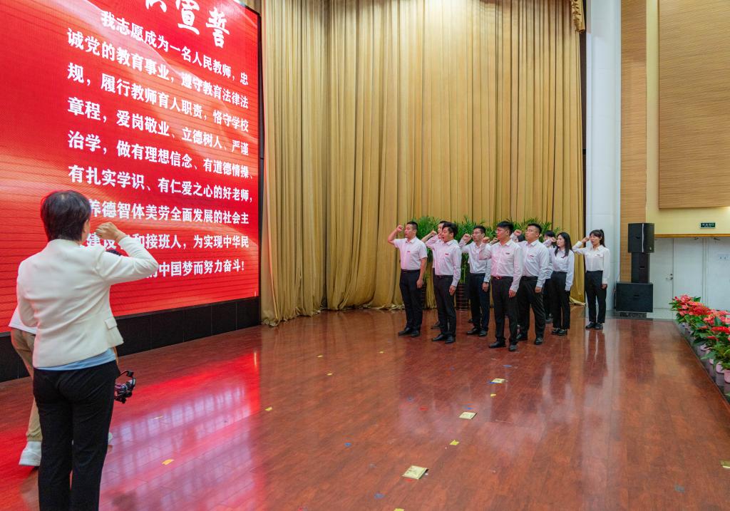 在电子与信息工程学院周军教授的带领下,新入职教师代表面向国旗庄严宣誓,忠诚党的教育事业,履行教师育人职责。