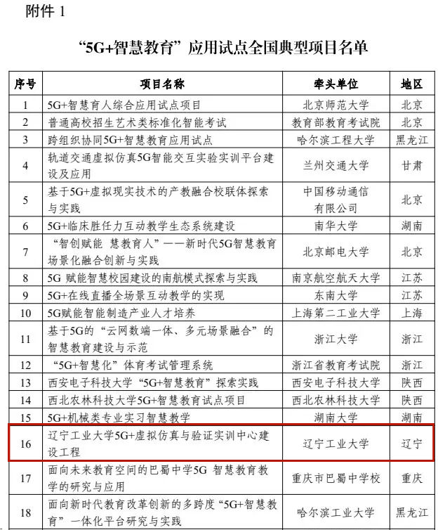 日前,工业和信息化部、教育部印发通知,公布“5G+智慧教育”应用试点全国典型项目及通过验收项目名单,44个入选全国典型项目,93个通过验收。“beat365英国官方网站5G+虚拟仿真与验证实训中心建设工程”项目成功入选全国典型项目,为辽宁省唯一入选项目。
