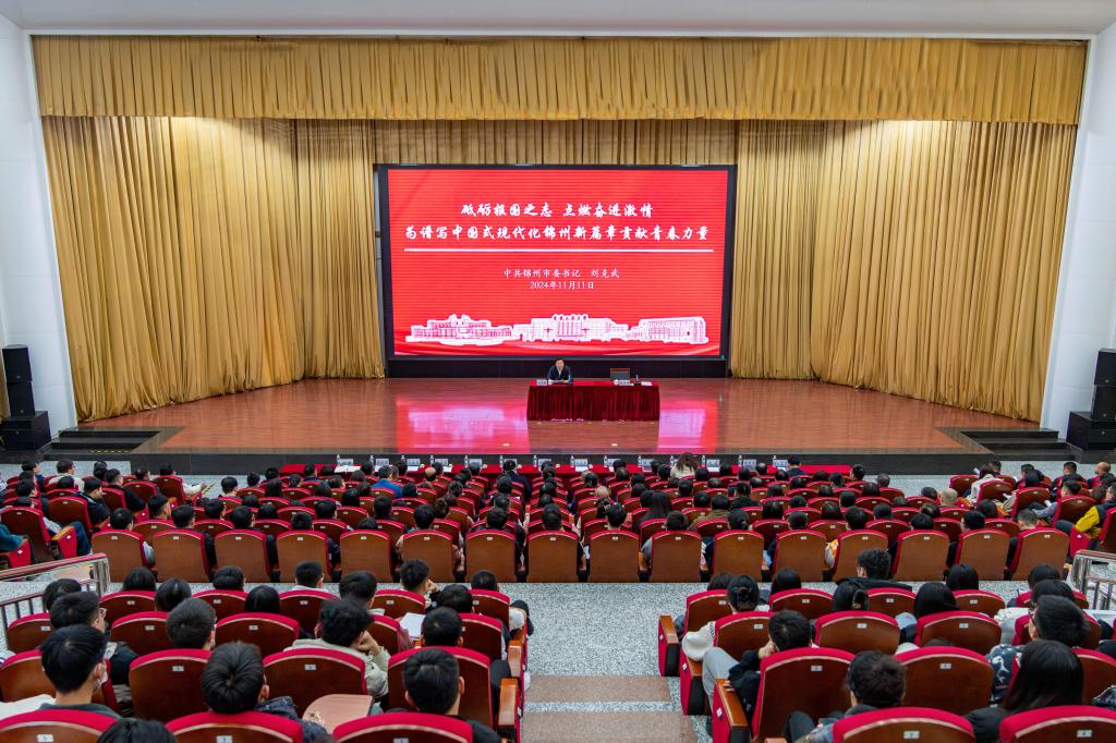 11月11日,锦州市委书记刘克武到beat365官网讲授思政课,围绕学习贯彻习近平新时代中国特色社会主义思想,深刻领悟“两个确立”的决定性意义,准确把握新时代东北、辽宁全面振兴使命任务,主动参与锦州区域中心城市建设,与师生们进行深入交流,鼓励广大师生砥砺报国之志,点燃奋进激情,为谱写中国式现代化锦州新篇章贡献青春力量。校党委书记钱英伟主持。