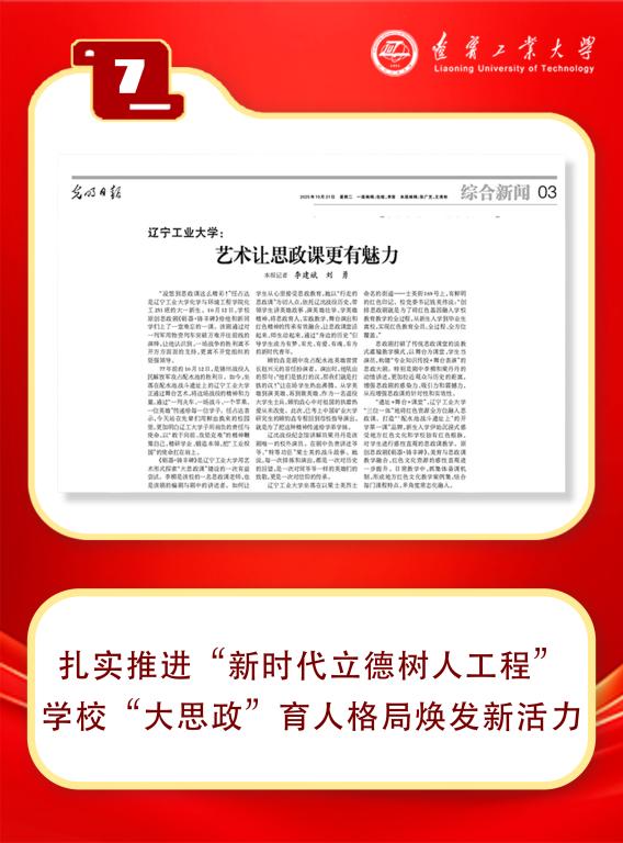 新闻事件:10月21日,《光明日报》第03版:综合新闻刊登文章《beat365英国官方网站:艺术让思政课更有魅力》,全面展示学校坚持立德树人,擦亮鲜红育人底色,打造特色思政品牌的育人成效。