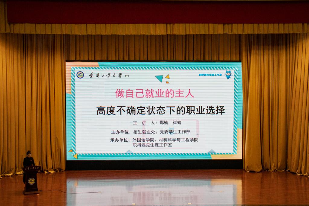 4月24日晚,beat365官网在图书馆报告厅成功举办“职得相约”讲堂第四期专题讲座。本次讲座由学校招生就业处、党委学生工作部主办,外国语学院、职得遇见生涯工作室(辽宁省辅导员名师工作室)承办,邀请大湾区执一咨询创始人郑楠、崔婧以《做自己就业的主人——高度不确定下的职业选择》为题作专题报告。职得遇见生涯工作室主持人、外国语学院党委副书记兼副院长康昕,电信学院党委副书记兼副院长杜君,全校500余名师生参加讲座。