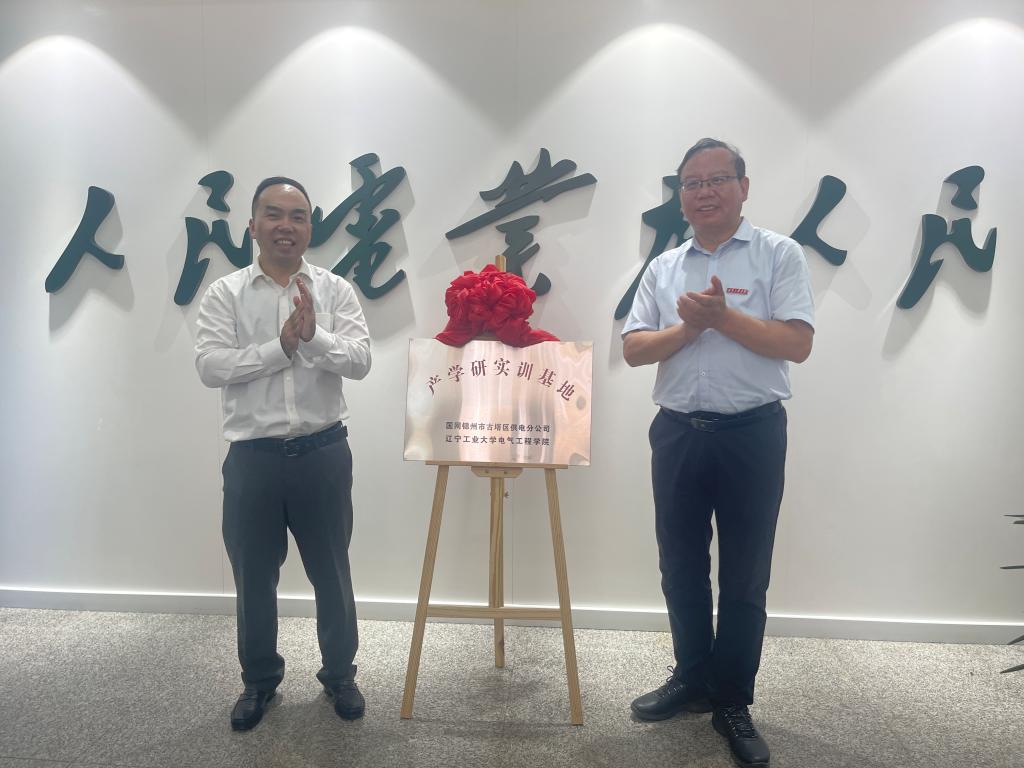 张启俭、王洪涛为“产、学、研”实训基地揭牌。电气工程学院院长白锐和郑湃签署了《beat365英国官方网站电气工程学院 锦州市古塔区供电分公司“产、学、研”实训基地建设合作协议》。(王江 文/摄影)