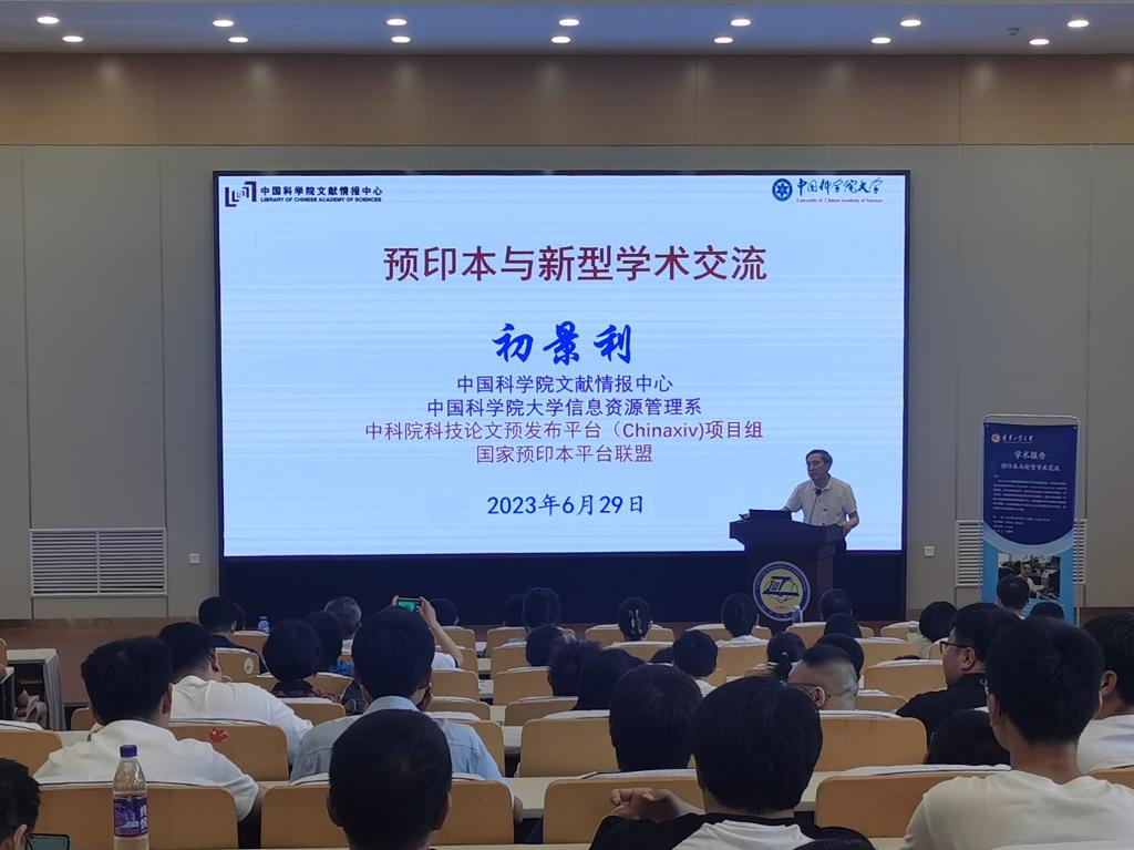 6月29日下午,图书馆联合科技处在第五教学楼党员教育培训中心举办“预印本与新型学术交流”讲座。邀请中国科学院大学经管学院信息资源管理系主任初景利教授作题为《预印本与新型学术交流》的报告。相关部门负责人、图书馆馆员,各学院教师、研究生近150人参加讲座。讲座由图书馆馆长刘振义主持。