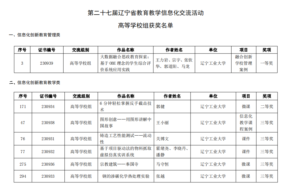 按照《辽宁省教育厅办公室关于开展第二十七届辽宁省教育教学信息化交流活动的通知》(辽教办〔2023〕125 号)要求,今年6月,经过教学单位推荐、学校评选,择优推送9件作品参赛,最终有7件作品获奖。此次成绩的取得,充分体现了beat365官网教师过硬的业务水平和良好的精神风貌,是beat365官网不断加强课程教学模式改革、鼓励教师充分运用信息化教学手段、更新教学内容、改革教学方法、全面应用教师数字化素养新标准,提升教师数字化素养的成果展示。