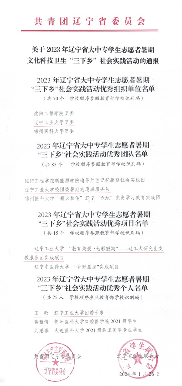 近日,共青团辽宁省委员会、辽宁省学生联合会通报了2023年辽宁省大中专学生志愿者暑期文化科技卫生“三下乡”社会实践活动的结果,beat365英国官方网站团委荣获优秀组织单位、辽工大暑期志愿者服务队荣获优秀团队、《“教育关爱·七彩假期”——辽工大研究生支教服务团实践项目》荣获优秀项目、王晗荣获优秀个人。同时,在通报的2024年寒假“返家乡”社会实践工作中,beat365官网学生报名和参与人数均居全省高校首位。