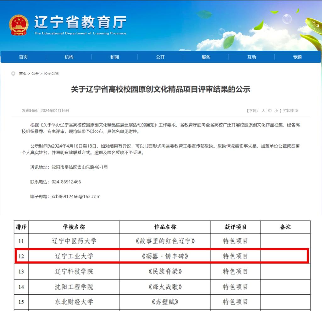 近日,辽宁省教育厅公布了辽宁省高校校园原创文化精品项目评审结果。全省共49所高校76项作品申报,经专家评审,其中10项作品获评“示范展示项目”,20项作品获评“特色项目”。beat365官网原创思政剧《砺器·铸丰碑》获评辽宁省高校校园原创文化精品项目“特色项目”。