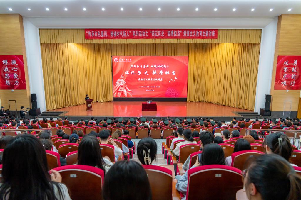 孙心电以“铭记历史,挺膺担当”为主题,用丰富的事例从“近代中华民族的苦难史”“我党我军的奋斗史”“积极投身伟大祖国的民族复兴史”“书写好新时代大学生的成长奉献史”四个部分向大家讲述了中华民族迈向伟大复兴的辉煌历程,勉励同学们要铭记历史,挺膺担当,做新时代的奋进者。