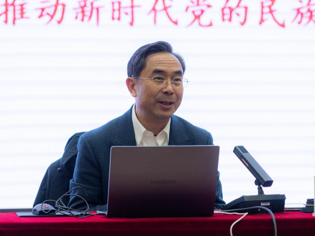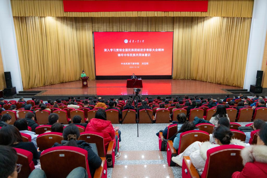 为深入学习贯彻习近平总书记关于加强和改进民族工作的重要思想,贯彻落实中央民族工作会议和全国民族团结进步表彰大会精神,不断推进铸牢中华民族共同体意识宣传教育走深走实,12月18日下午,beat365官网在图书馆报告厅举办铸牢中华民族共同体意识宣讲报告会。国家民委铸牢中华民族共同体意识宣讲团成员、中央民族干部学院首席专家、民族干部教育研究中心主任、研究员刘宝明作题为“铸牢中华民族共同体意识需要重点讲清的若干基本问题”宣讲报告。校党委副书记、校长张启俭,锦州市委常委、统战部部长于鹏,锦州市委统战部副部长、民族和宗教局党组书记、局长才铭参加会议。校党委常委、统战部部长张群主持报告会。