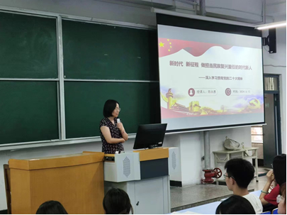陈永惠围绕“党的二十大”“党的二十大精神”“如何做担当民族复兴任务的时代新人”等三个方面进行党课。党的二十大不仅为新时代的发展指明了方向,还提供了行动纲领,对于推动中国特色社会主义事业的发展具有重要意义。她强调,做时代新人,一是具备深厚的爱国情怀,能够深刻理解中华民族的历史文化、民族精神和时代价值,将个人的理想追求融入到国家和民族的发展大局中。二是坚定理想信念,勇于担当起时代赋予的历史使命。三是具备深厚的文化底蕴。陈书记表示时代新人不仅要掌握扎实的专业知识技能,还要具备广博的文化素养,不断从中汲取智慧和力量,增强文化自觉和文化自信。四是具有创新精神,时代新人应敢于创新、善于创新,注重培养创新思维和创新能力,努力成为各自领域的佼佼者。五是具备宽广的国际视野和开放的心态,了解世界发展趋势和国际形势变化,积极参与国际交流与合作,借鉴和吸收世界各国优秀文明成果,不断提升自身的综合素质和竞争力。