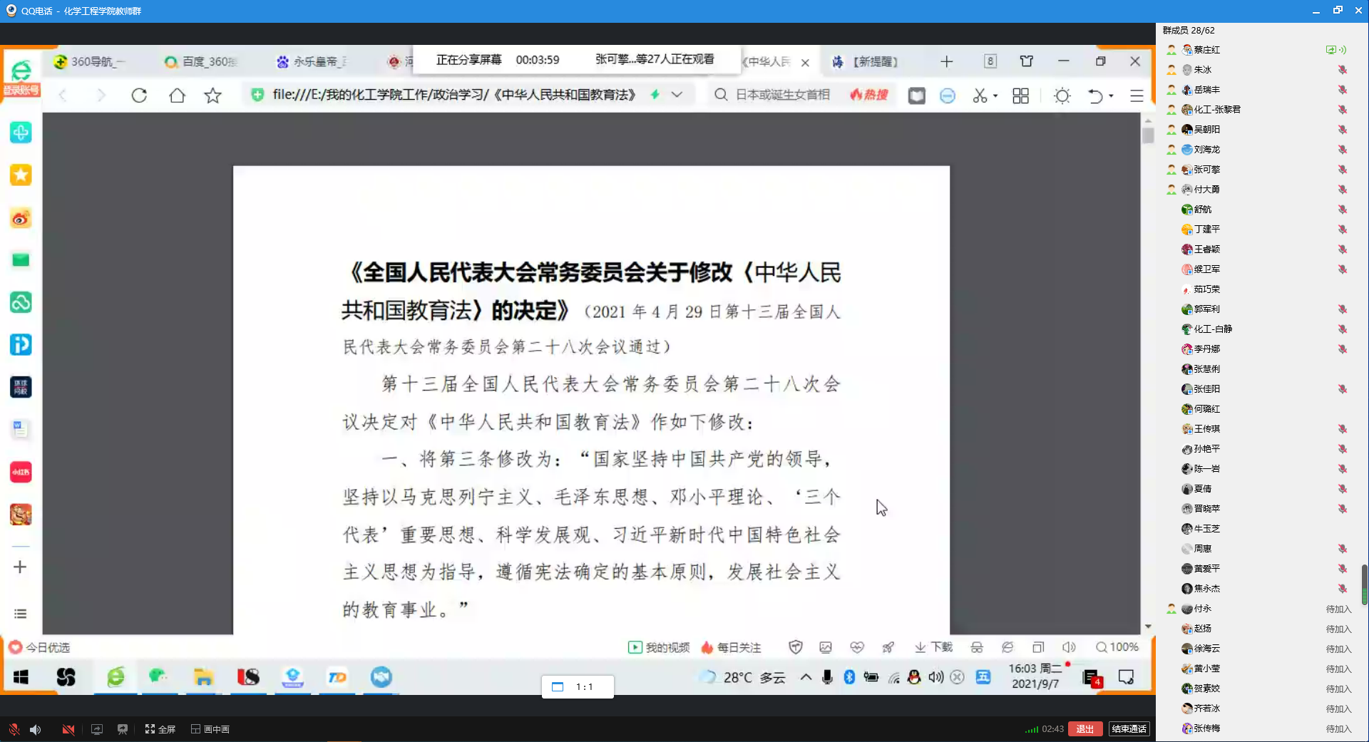 为做好新修订的教育法的学习宣传和贯彻实施工作,2021年9月7日下午,化学工程学院组织开展《中华人民共和国教育法(2021修订)》专题学习研讨,全体教师参加了学习会,会议由学院党总支书记蔡庄红主持。