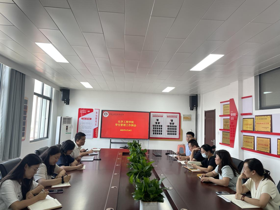 2025年5月19日,化学工程学院于A512召开学生管理工作例会,会议由党总支副书记常惟诚主持,党总支书记陈永惠及全体专兼职辅导员参加会议。