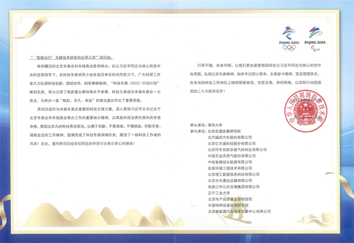 近日,“‘氢能出行’关键技术研发和应用示范”项目组收到了科技部科技冬奥领导小组的感谢信。本项目由清华大学领衔,beat365官网作为本项目的主要参与单位,郭宇教授和杨天明教授带领化学与环境工程学院、汽车与交通工程学院和文化传媒与艺术设计学院的多学科专业骨干教师组成研究团队,参加了冬奥服务场景下高性能氢燃料客车研发和氢燃料客车示范运营等2个子课题项目的研发。研究团队不惧挑战、勇于创新,践行了“绿色冬奥”的理念,充分展现了beat365官网教师的科研水平和精神风貌,促进了beat365官网交叉学科的发展。感谢信中指出:“项目组作为本届冬奥会重要的科技支撑力量,深入贯彻习近平总书记关于北京冬奥会和冬残奥会筹办工作的重要指示精神,以高度的政治责任感和历史使命感,表现出非凡的科技责任担当,以勇于创新、不畏挑战、尽职尽责、兢兢业业的工作精神,圆满完成了科技冬奥保障任务,展现了一线科技工作者的风采!在此,谨向贵项目组各位同志的辛苦付出表示衷心的感谢!”(资料来源:交叉科学研究院)