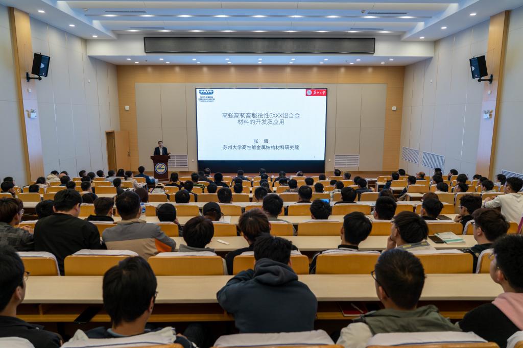在5号楼201会议室,张海教授以《高强高韧高服役性6XXX铝合金材料的开发及应用》为题为学校师生作学术报告,他结合“双碳”背景下汽车行业的发展趋势,从国际碳减排、国家“双碳”政策,汽车全生命周期内碳排放规律等方面介绍了新能源汽车发展对绿色低碳铝合金材料的现实需求,并对苏州大学汽车轻量化课题组6XXX铝合金材料的开发和最新研究成果进行了详细介绍。宗长富、宿佳敏分别以《新能源智能汽车线控底盘技术》《新能源汽车的轻量化与智能化浅析》为题作了学术报告。三位专家多领域、前沿交叉的学术报告引起了与会师生的热烈反响。报告会后,三位专家就汽车材料轻量化技术、智能化控制技术与相关学院科研团队、博士青年教师进行了座谈交流。
