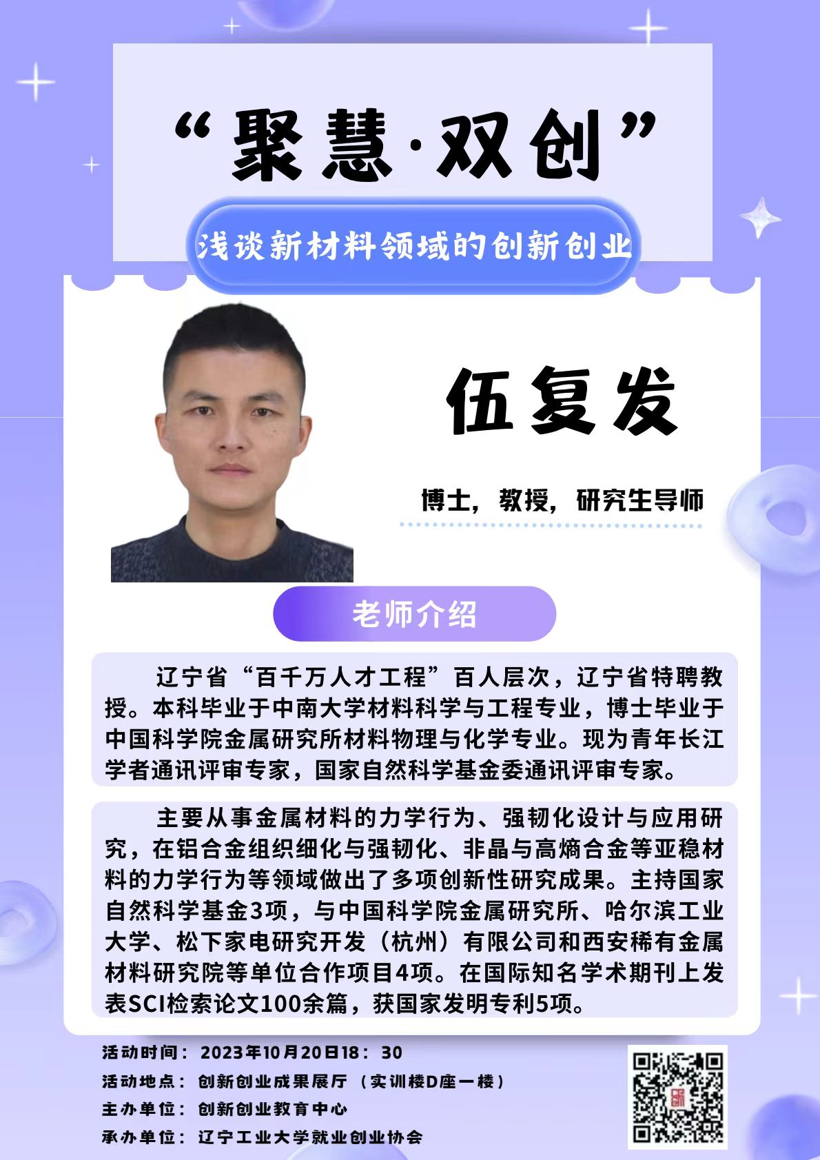 伍复发,博士,教授,研究生导师,辽宁省“百千万人才工程”百人层次,辽宁省特聘教授。本科毕业于中南大学材料科学与工程专业,博士毕业于中国科学院金属研究所材料物理与化学专业。现为青年长江学者通讯评审专家,国家自然科学基金委通讯评审专家。
