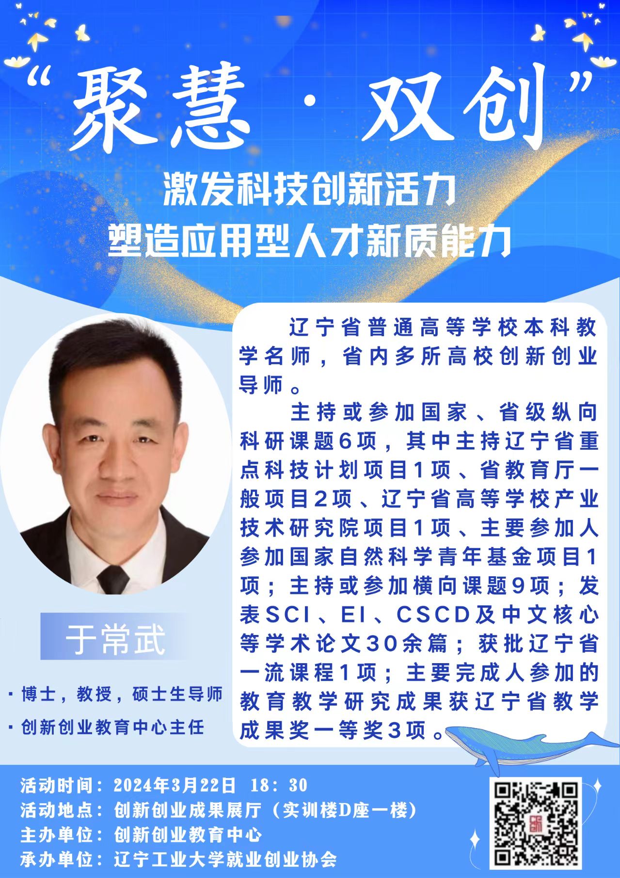 于常武,博士,教授,硕士生导师,创新创业教育中心主任,辽宁省普通高等学校本科教学名师,省内多所高校创新创业导师。