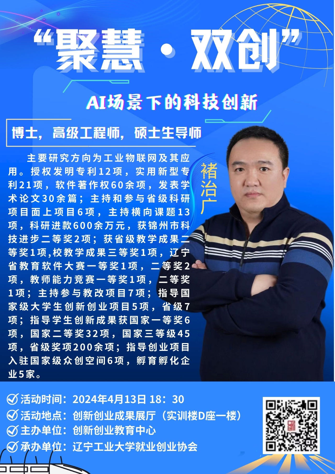 褚治广,博士,高级工程师,硕士生导师,主要研究方向工业物联网及其应用。授权发明专利12项,实用新型专利21项,软件著作权60余项,发表学术论文30余篇;主持和参与省级科研项目面上项目6项,主持横向课题13项,科研进款600余万元,获锦州市科技进步二等奖2项;教学成果获省级教学成果二等奖1项,校教学成果三等奖1项,辽宁省教育软件大赛一等奖1项,二等奖2项,教师能力竞赛一等奖1项,二等奖1项;主持参与教改项目7项;指导国家级大学生创新创业项目5项,省级7项;指导学生创新成果获国家一等奖6项,国家二等奖32项,国家三等级45项,省级奖项200余项;指导创业项目入驻国家级众创空间6项,孵育孵化企业5家。