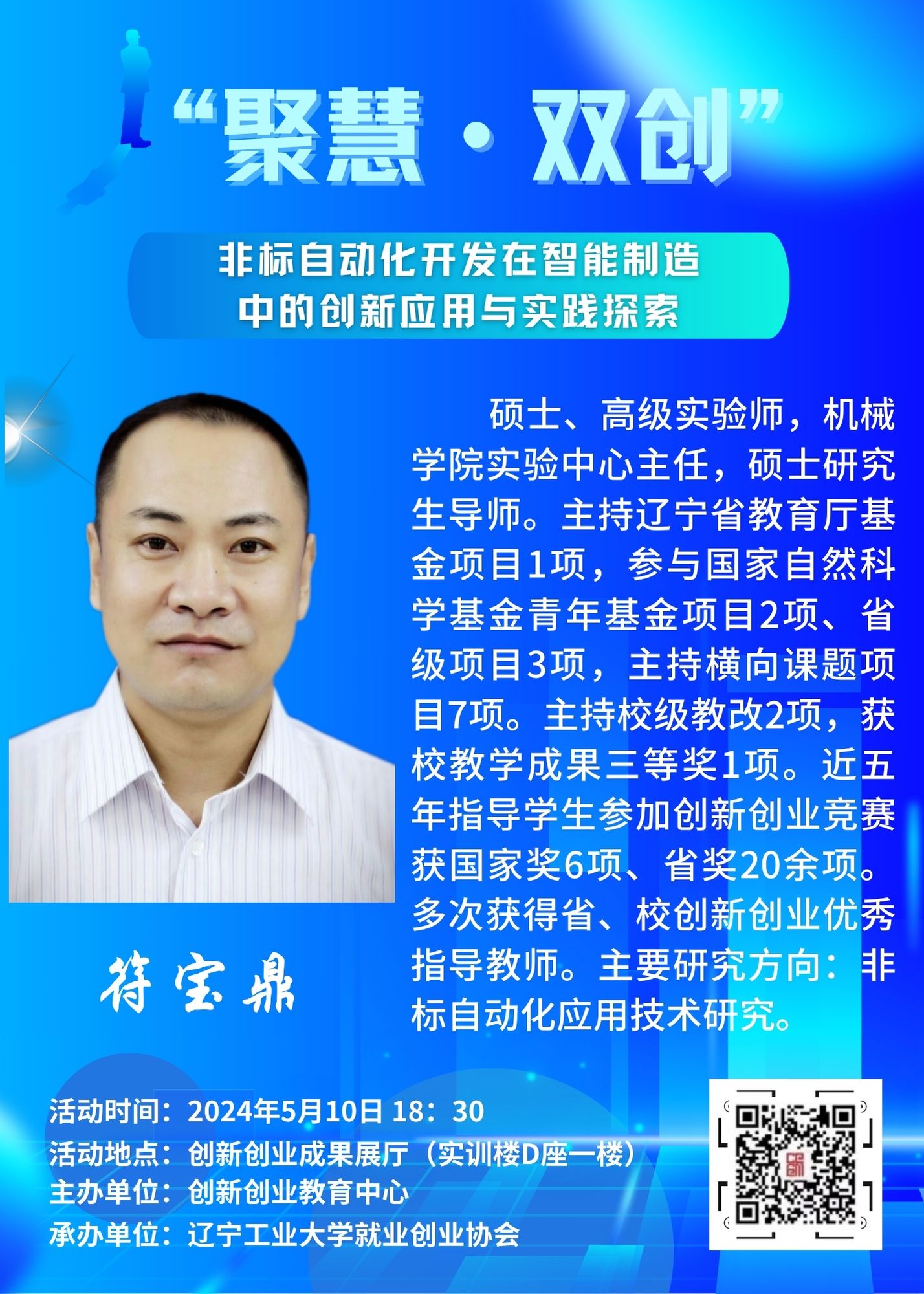 符宝鼎,硕士,高级实验师,机械学院实验中心主任,硕士研究生导师。