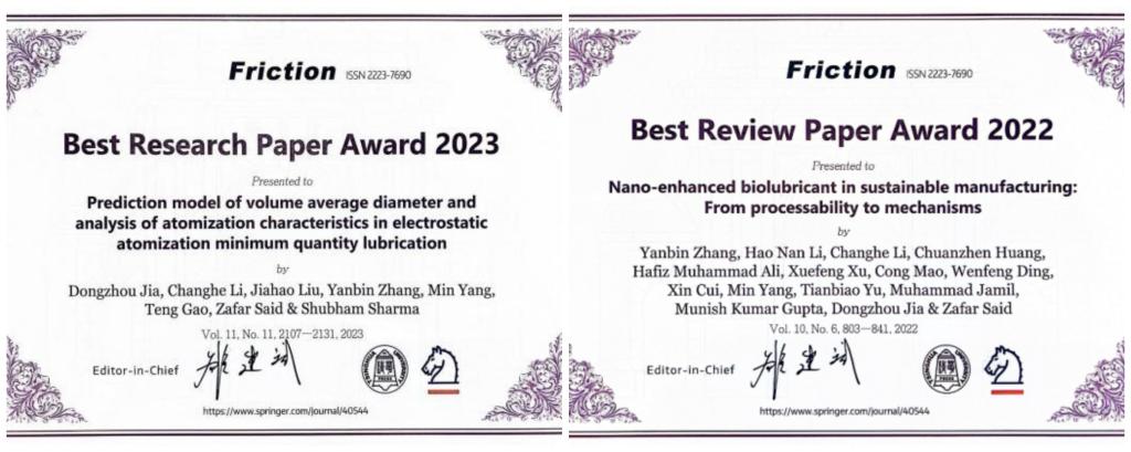 贾东洲的主要获奖论文题为“Prediction model of volume average diameter and analysis of atomization characteristics in electrostatic atomization minimum quantity lubrication”。该研究在精密制造过程中的绿色润滑冷却技术方面提出了创新模型与方法,因其重要的理论价值与工程应用前景,获评2023年度最佳研究论文。其参与撰写的综述论文也因高度的系统性和前瞻性,同时获颁2022年度最佳综述论文奖。